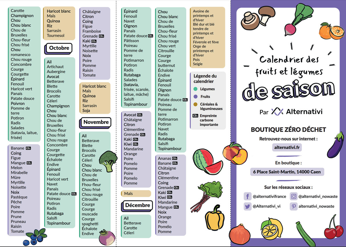 Pour vous aider dans vos choix, notre calendrier des fruits et légumes de saison mentionne également les céréales et légumineuses à retrouver à différents moments de l’année. Mais surtout la petite indication « CO2 » vous informe sur les produits qui respectent la saisonnalité, mais qui ont une empreinte carbone importante.