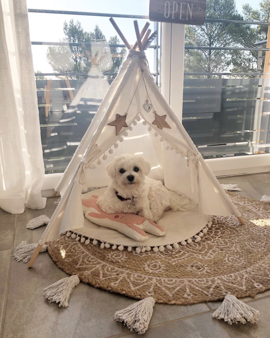 Que diriez-vous d’une petite tente ?! Très tendance, le tipi est déjà adopté dans la chambre des enfants. Il peut aussi se retrouver dans le salon pour accueillir votre fidèle compagnon lors de ses dodos ! Un vieux drap, cinq tuteurs en bois ou en bambou, un peu de colle et le tour est joué ! Glissez un coussin géant dedans et votre chien a sa petite maison dans la vôtre. Retrouvez le joli modèle ci-dessus, sur le compte instagram de ma.jolie_deco.