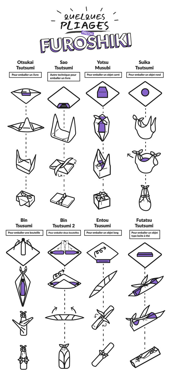 Tout l’art du furoshiki repose sur les techniques de nouage et de pliage pour emballer vos objets sans recourir à la moindre épingle, bouton ou broche et maintenir le tissu en place.