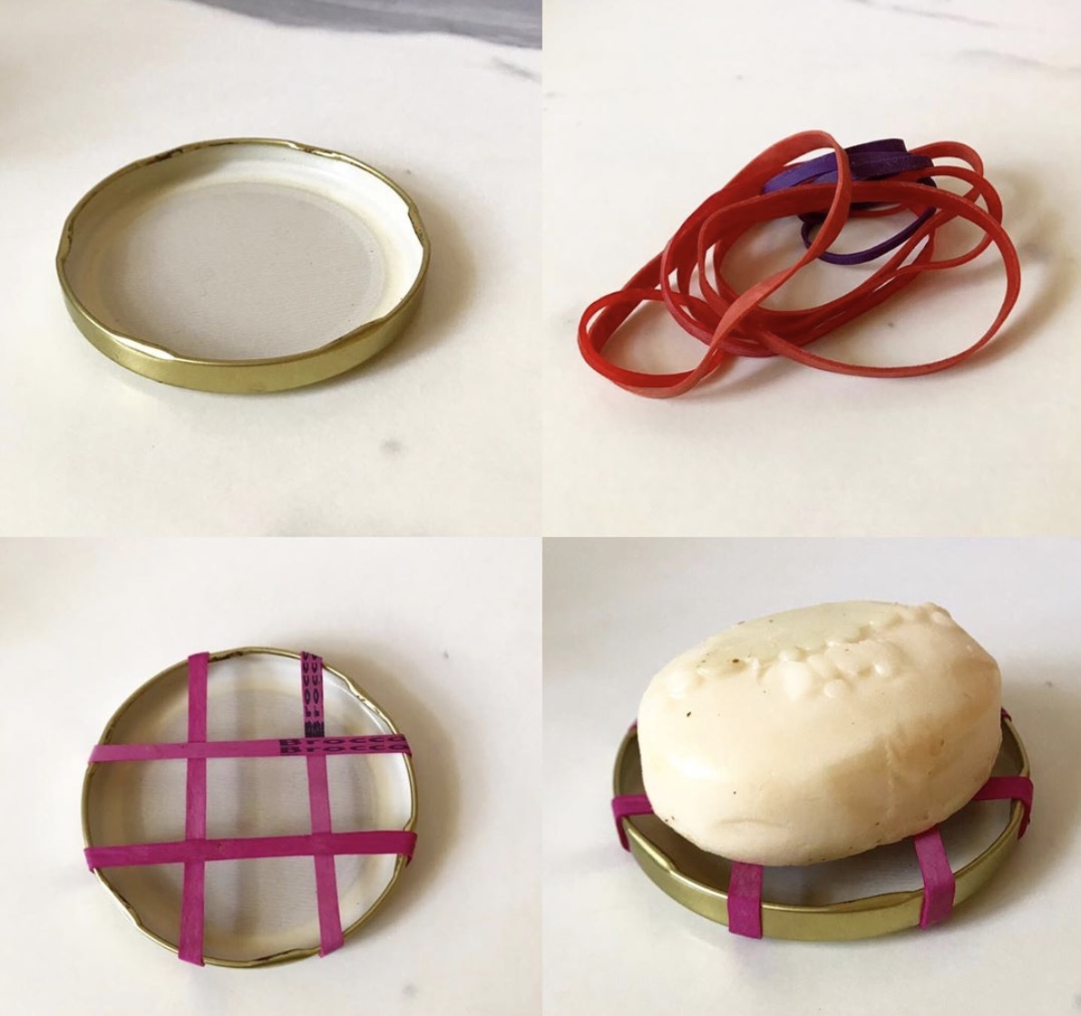 Un couvercle de bocal en verre, quatre élastiques, voilà le matériel nécessaire pour concevoir un porte-savon minimaliste. Réalisez un damier comme un tic-tac-toe autour du couvercle et c’est tout ! C’est pratique, c’est zéro déchet et c’est surtout très facile à réaliser. Ce joli modèle est une réalisation de l’instagrameuse @rocket_science.