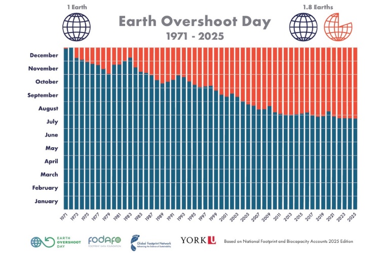 Évolution de la date du Jour du dépassement global de 1971 à 2025. Chaque barre représente la date à laquelle les ressources annuelles ont été épuisées : en bleu, la part de l’année soutenable avec “une Terre” (consommation égale aux ressources disponibles), en rouge la période de dépassement au-delà des capacités planétaires.