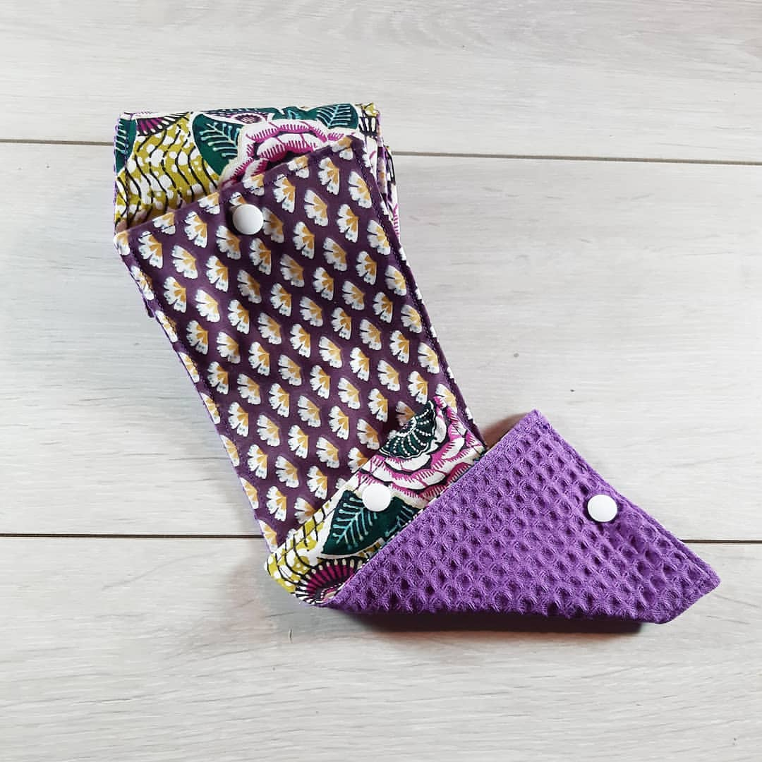 Sur la photo ce papier hygiénique lavable possède un système de boutons pression qui relient les feuilles pour former un rouleau. Retrouvez ce modèle sur le compte instagram @lescouturesdaena