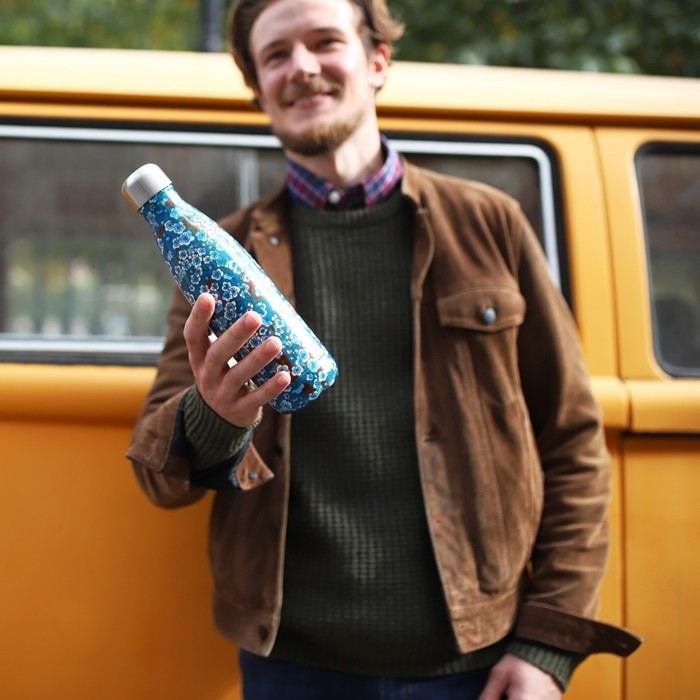 La bouteille 500 ml Qwetch modèle Flowers Blue est une bouteille réutilisable en inox. Ses motifs délicats de fleurs bleues japonisantes en font presque tout autant un élément de décoration que de consommation.