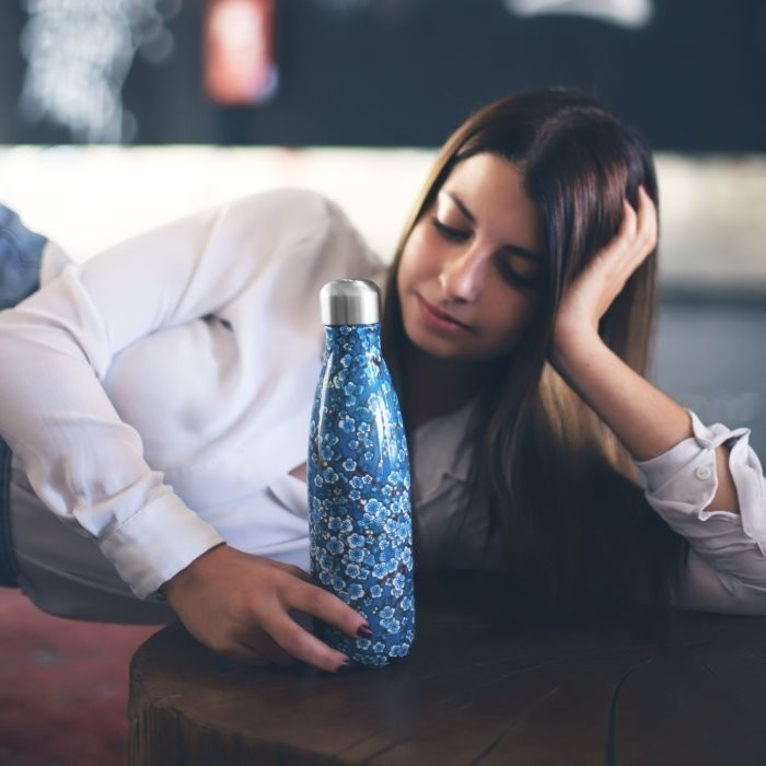 Bouteille isotherme Qwetch modèle Flowers blue en 500 ml. 12 heures de froid, 24 h de chaud.